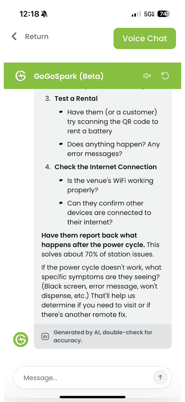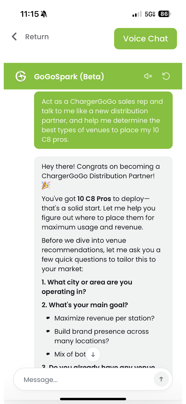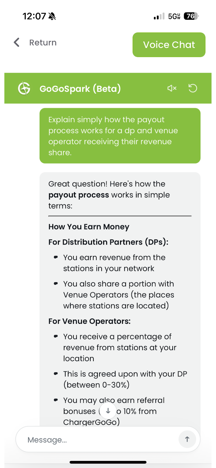 GoGoSpark is an AI-powered assistant designed to help Distribution Partners (DPs) operate, grow, and troubleshoot their ChargerGoGo business. This guide explains how to ask GoGoSpark questions effectively so you get accurate, actionable answers when: