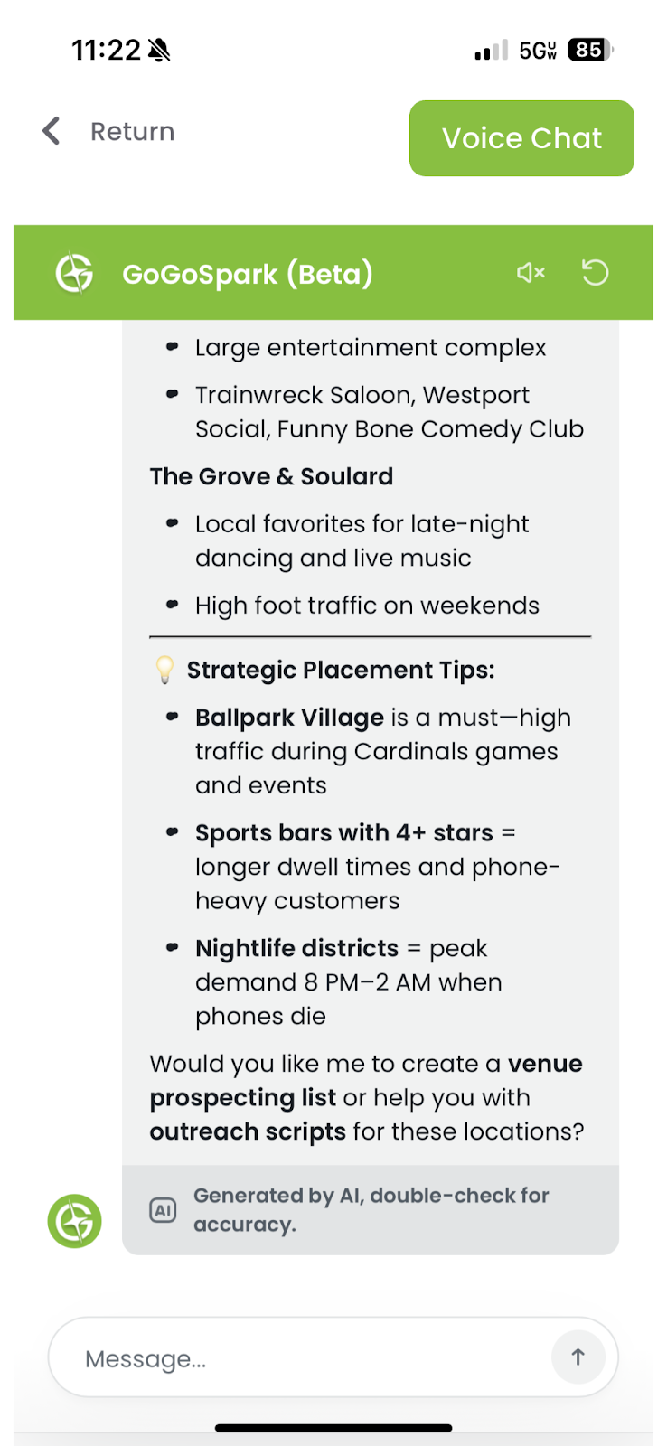 “Help me find high-potential locations for ChargerGoGo in downtown Austin. Focus on bars and casual dining.”